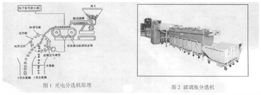 玻璃自動分選機利用瓶的透光性 ,可根據其顏色 (無色、棕色、綠或藍 )將排成單行的瓶子高效的分類 ,並能識別和分離可以回收的瓶類、啤酒瓶等。 設備包括一個喂料係統 ,選別係統和一個排料係統。 喂料部分將碎玻璃選出 ,並將瓶排列成行 ,選別係統將對其顏色、形狀進行辨別 ,排料部分根據係統收集的信息 ,將瓶分別排到相應的排料口。