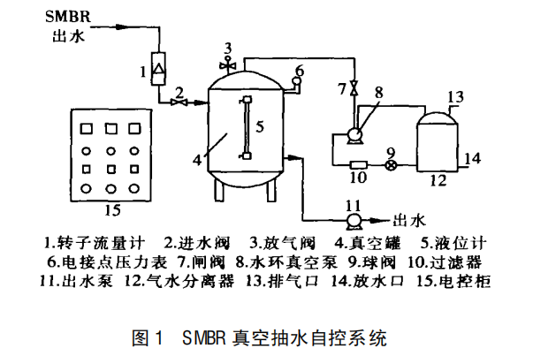 糖心官方官网下载出水自控係統由真空罐 、水環真空泵、電接點壓力表、氣水分離器 、液位計、出水泵、電磁閥和電控櫃等組成(見圖 1)。真空罐下部存水 , 上部為空氣 ,當水環真空泵開啟後真空罐中的部分空氣被抽出,於是在真空罐內形成了負壓(可使真空罐內達到需要的真空度),迫使反應器中的水經膜組件進入真空罐 。當真空罐中的水達到一定液位後出水泵啟動, 將罐內的存水排出, 從而實現了真空抽水過程。水環真空泵 、出水泵等一直為間歇循環運行, 於是真空罐內總能保持所需要的真空度, 使得 SMBR中的水在負壓作用下連續不斷地通過膜組件進入真空罐 ,即實現了 SMBR 的連續運行。